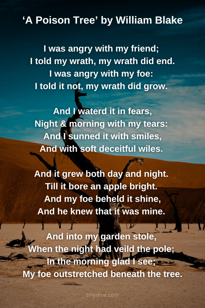 “The Poison Tree” by William Blake, a poem from his collection Songs of Experience (1794), explores themes of anger, repression, and the consequences of unaddressed emotions. Through vivid imagery and simple yet powerful language, Blake delves into the psychological effects of harboring resentment and the potential dangers it poses.