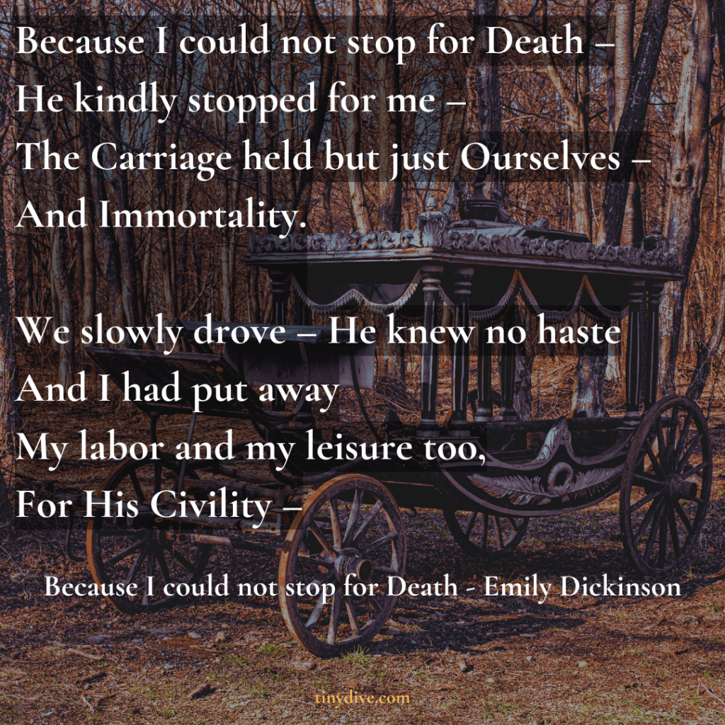 Emily Dickinson‘s poem “Because I Could not Stop for Death” is one of her most celebrated works, exploring themes of mortality, the passage of time, and the afterlife. Through personification, vivid imagery, and a calm, contemplative tone, Dickinson presents death not as something to be feared but as an inevitable, natural part of life.