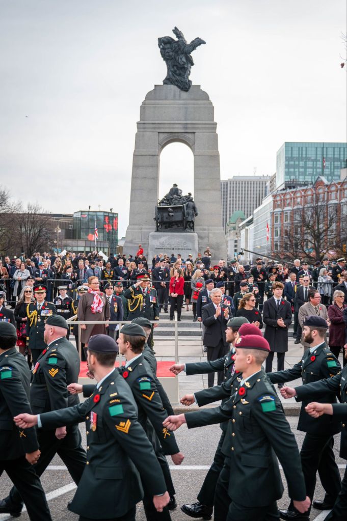 On Remembrance Day, Canadians observe a moment of silence at 11:00 a.m. to honor those who have served. Across the country, ceremonies are held at cenotaphs, war memorials, schools, and in communities large and small. The National War Memorial in Ottawa serves as the focal point for the national ceremony, which includes a parade of veterans, a flyover, the laying of wreaths, and the playing of The Last Post.